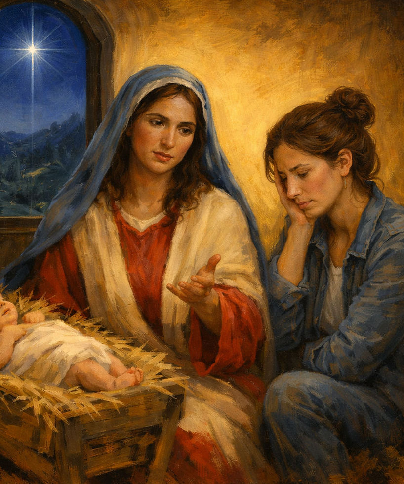 Minha querida irmã, entre aqui, sente-se ao meu lado. Jesus dormiu. Olhe para além da janela. O sol ainda não subiu pelas colinas de Belém. Minha amada, ontem foi uma noite gloriosa. Ouvi canções de anjos enchendo o céu, enquanto uma estrela iluminava esta gruta. Lembrei do dia em que fui visitada por um anjo quando fui chamada de bendita entre as mulheres. Aquele dia, acreditei ser bem aventurada, mas ouça lá fora. Os barulhos dos mercadores, os gritos de crianças e os passos apressados. Ouça o mundo alheio ao seu Salvador que nasceu aqui dentro. Olhe para ele, minha querida. Você pode contemplar o que os olhos naturais não podem discernir? O infinito está enrolado em panos, dormindo em um punhado de feno. Apesar disso, hoje é um dia extraordinariamente comum. Hoje sou uma mamãe que precisa lavar os paninhos. Olhe, esse semblante pequenino não desdenha da nossa pequenez. Você está exausta, eu sei, minha querida. As tarefas do lar te cansam. Essa dor no seu corpo e esse horizonte incerto te deixa exausta. Eu compreendo. Olhe para mim agora. O meu filho, o meu Salvador está nessa manjedoura, perfumada de animais. Mas perceba, o Criador deixou que eu O ninasse e O alimentasse. Não esqueça querida, ele não desprezará o cuidado que você dedica aos seus. Não pensem que o serviço a Deus acontece apenas nos altares de ouro ou nas canções de triunfo. O serviço a Deus acontece nas madrugadas, enquanto você nina, seu bebê. Nesta manhã, não estou no templo. Estou no chão de uma estrebaria. Minhas vestes estão empoeiradas, meu cabelo desarrumado, mas nunca estive tão perto de Deus, minha amada. Olhe para este olhar sereno. O meu bebê agora é o seu Jesus. O meu bebê é o seu Deus. O Emanuel. Deus contigo nas tarefas domésticas, nas dores lombares, na noite mal dormida, no rosto lavado, nas unhas não feitas, no coque do cabelo, na solidão, na carência, Deus contigo. Não desanime se a sua vida parecer um estábulo humilde. Se Cristo habita em você, esse estábulo é mais glorioso que o palácio de Herodes. Seja forte e corajosa, minha amada. Oh! desculpe, preciso ir. Jesus acordou. Está chorando, e precisa do meu alimento. Olhe para a janela,minha amada, o sol já brilha no topo das montanhas.